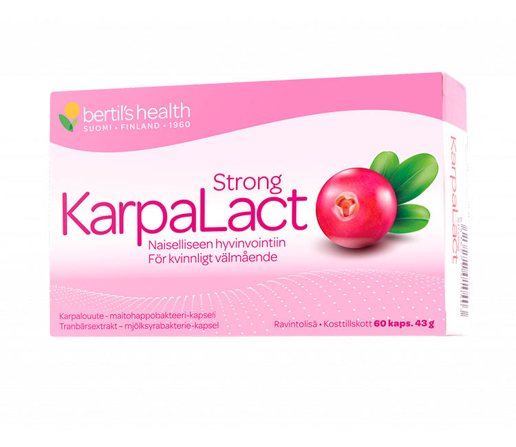 KarpaLact on korkealaatuinen yhdistelmävalmiste naiselliseen hyvinvointiin: Tutkittu CranMax-karpalouute ja maitohappobakteerit samassa kapselissa. Karpalon bioaktiiviset aineosat heikentävät haitallisten E.coli bakteerien tarttumista kasvualustaan. Hyvät maitohappobakteerit täydentävät elimistömme omia suolistobakteereja ja rajoittavat pahojen bakteerien ja hiivojen kasvutilaa.KarpaLact Strongin valmistuksessa käytetty vakioitu Cran-Max® - karpalouute sisältää kaikki karpalon osat; mehun, kuoret, hedelmälihan ja siemenet. Uute on suojattu Bio-Shield® –menetelmällä. Näin sen vaikutus säilyy vaikutusalueelle asti eikä vahingoitu vatsan hapoista.Käyttötarkoituksia:• naiselliseen hyvinvointiin• toistuvien antibioottikuurien tukena• lomamatkoille• pahanhajuisen virtsan aiheuttamiin ongelmiinKenelle:• nuorille ja keski-ikäisille naisille• senioreille• raskaana oleville ja imettäville äideille• paljon matkustaville• aktiivisille uimareille• sopii myös miehilleSaatavana myös riittoisassa 120 kappaleen pakkauksessa:KarpaLact Strong 120kaps Bertils Health