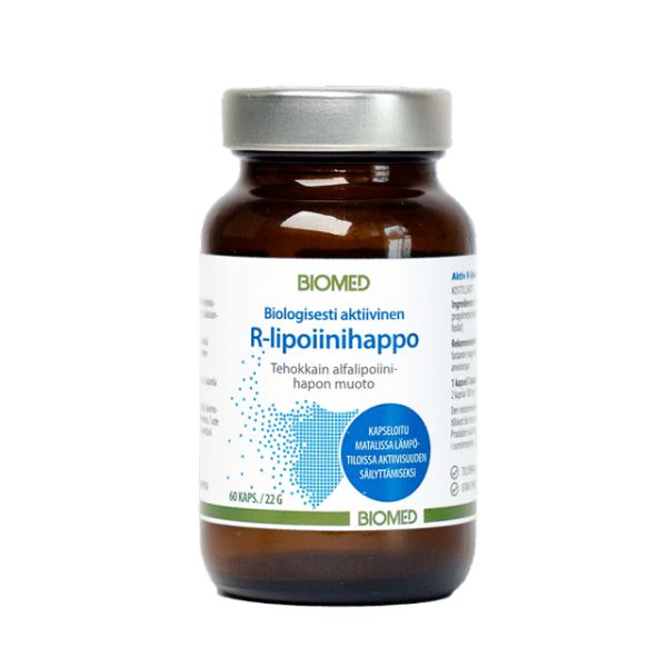 R-alfalipoiinihappo, joka on kapseloitu matalissa lämpötiloissa. Biomedin aktiivinen R-Lipoiinihappo sisältää ainoastaan alfalipoiinin luonnollista R-muotoa.