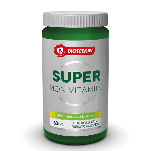 Monipuolinen vitamiini- ja hivenainevalmisteSuper Monivitamiini sisältää tasapainoisesti 13 vitamiinia ja 8 hivenainetta sekä bioflavonoideja hyvin imeytyvässä muodossa.Erityisesti urheiltaessa runsaasti ja monissa elämän erikoistilanteissa tarvitsemme tavallista enemmän vitamiineja ja hivenaineita. Ne mm. auttavat jaksamaan paremmin ja edistävät immuunijärjestelmän toimintaa.sinkki ja kupari edistävät immuunijärjestelmän normaalia toimintaaC- ja B2-vitamiini sekä niasiini ja pantoteenihappo auttavat vähentämään väsymystä ja uupumusta.Biotiini taas edistää hiusten ja limakalvojen pysymistä normaaleina, sekä edistää limakolvojen normaaleina pysymistä.Herkkämahaisten kannattaa nauttia Super Monivitamiinia päivän pääaterian päätteeksi.Yksi kapseli päivässä riittää!
