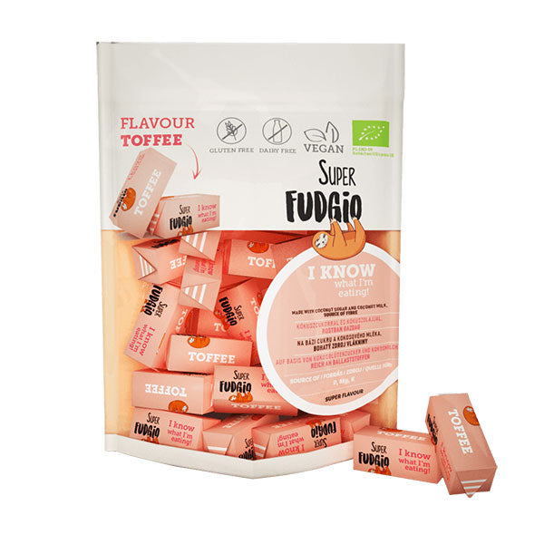 Super herkullinen, ihanan pehmeä ja maistuva toffeefudge on aidoista raaka-aineksista valmistettu lisäaineeton ja vegaaninen herkku. Superfudgio toffeet sopivat useille ruoka-aineallergisille: valmistuksessa on käytetty mm. kookosmaitoa ja -sokeria.Täydellinen herkku makeanhimon iskiessä.GLUTEENITON. LAKTOOSITON. VEGAANI.