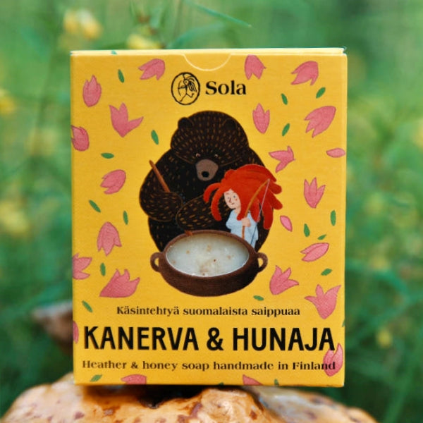 Palasaippua Kanerva & Hunaja on miedon tuoksuinen luonnonsaippua, jossa on käytetty suomalaista luomukauraa, kanervankukkia, paljon hunajaa ja mehiläisvahaa sekä aprikoosinsiemenöljyä. Hajustettu kevyesti muskatellan ja luomuappelsiinin eteerisellä öljyllä. Hyvä kaikille ihotyypeille.