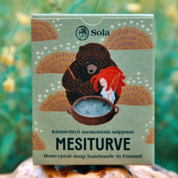 Luomusaippua Mesiturve sisältää kosmetiikkalaatuista turvetta ja suomalaista hunajaa, joka tuoksuu rosmariinilta. Lempeä palasaippua hoitaa ja hellii ihoa.