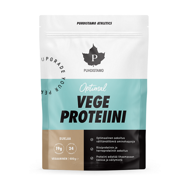 Puhdistamon Optimal Vege Proteiini Suklaa on korkealuokkainen kasviperäinen proteiini. Se sisältää riisiproteiinia ja herneproteiinia ja omaa lähes täydellisen aminohappoprofiilin. Luonnollinen proteiinijauhe, joka on valmistettu ilman mitään kompromisseja.