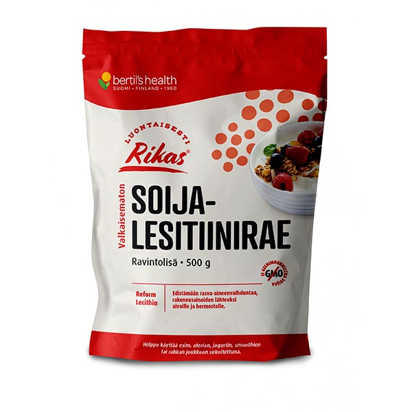 Rikas Soijalesitiinirae on ns. valkaisematonta soijalesitiiniä, joka on tuotettu mahdollisimman hellävaraisilla menetelmillä. Soijalesitiini on luontainen, soijapavuista valmistettu ravintoaine. Soijalesitiini koostuu pääosin ns. fosfolipideistä, joita tarvitaan elimistömme kaikkien solukalvojen rakenteisiin, hermoston toimintaan ja tasapainoiseen rasva-aineenvaihduntaan.