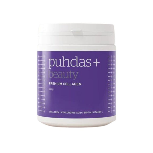 Puhdas+ Premium Collagen on tehokas ja monipuolinen kollageenivalmiste. Se sisältää tutkittua, hydrolysoitua kollageenia, hyaluronihappoa, biotiinia ja C-vitamiinia. Tuotteen kollageeni tukee ihon rakennetta ja hyaluronihapolla on ainutlaatuinen kyky sitoa itseensä vettä. Biotiini edistää ihon ja hiusten pysymistä normaalina. C-vitamiini edistää normaalia kollageenin muodostumista ihon normaalia toimintaa varten. Helppokäyttöinen ja hyvin imeytyvä jauhe.