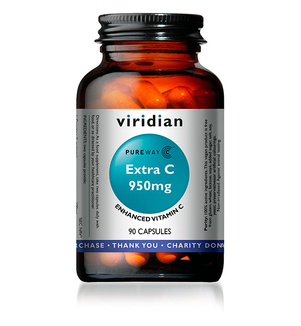Viridian Extra-C sisältää PureWay-C:tä, patentoitua C-vitamiiniyhdistettä, jossa on mukana rasvaliukoisia osasia ja bioflavonoideja. C-vitamiini on tärkeää muun muassa vastustuskyvylle, paljon liikkuville, väsyneille ja uupuneille sekä parantamaan raudan imeytymistä. C-vitamiini on tarpeellinen myös kollageenin rakennusaineeksi, ihon hyvinvointiin, hermostolle ja energia-aineenvaihdunnalle.- luonnollinen- vatsaystävällinen ja aktiivinen C-vitamiini- hyvin imeytyvä ja säilyy elimistössä pidempään kuin tavallinen C-vitamiini. Saatavana myös pienemmässä 30 kappaleen pakkauksessa: Viridian Extra C 950mg 30kaps