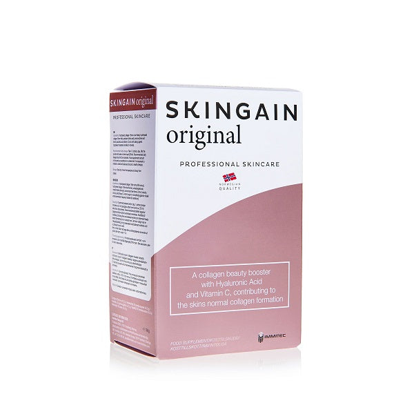 Skingain Original sisältää 1. ja 2. tyypin kollageenia, hyaluronihappoa ja C-vitamiinia. Korkealuokkaiset, tutkitut, eurooppalaiset raaka-aineet. Nopeatehoinen kollageenijuoma kaunistaa ihoa ja tuuheuttaa hiuksia. Ajan myötä iho menettää luonnollisen elastisuutensa ja kosteutensa ja siihen muodostuu iän tuomia merkkejä. Skingain on uusi ja luonnollinen tapa hidastaa ihon vanhenemisprosessia. Skingain tuo auttaa myös sidekudos- ja nivelpohjaisiin ongelmiin.