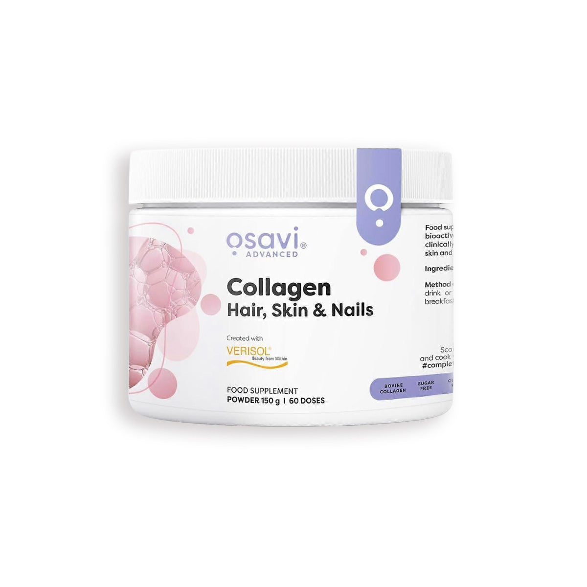 Osavin Kollageenijauheet – Skin & Beauty sisältää tutkitun Verisol®-kollageenin, joka vaikuttaa ihon kimmoisuuteen ja tukee sen rakennetta sisältä käsin. Verisol® on hydrolysoitu bioaktiivinen kollageenipeptidi, joka imeytyy hyvin ja stimuloi elimistön omaa kollageenin sekä elastiinin tuotantoa.